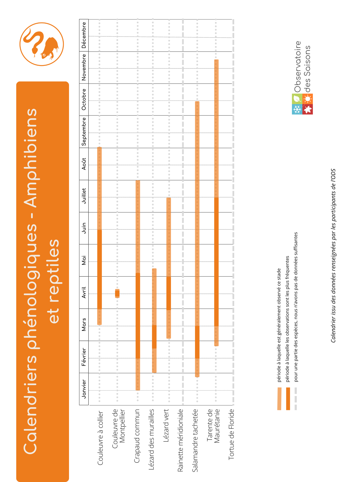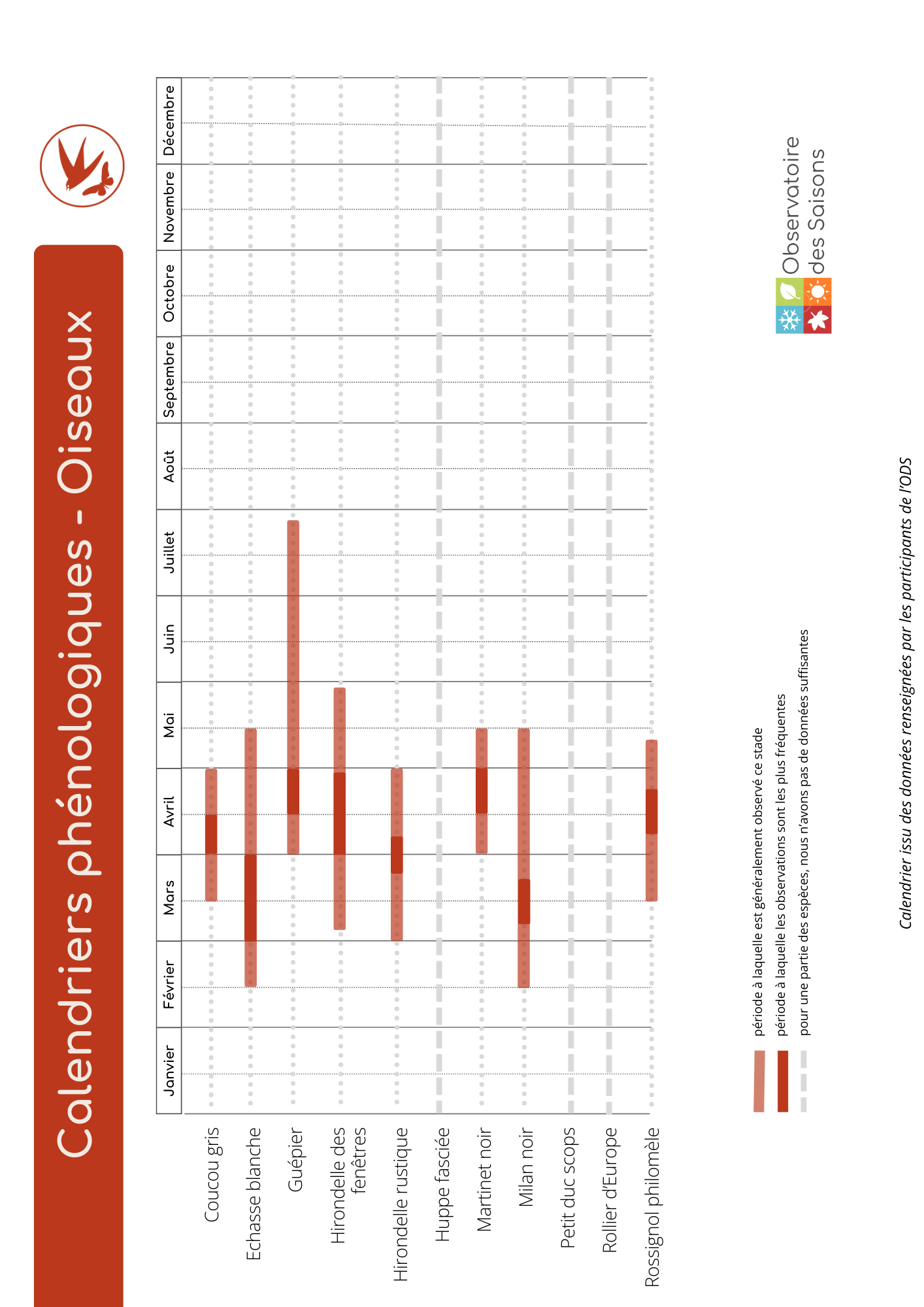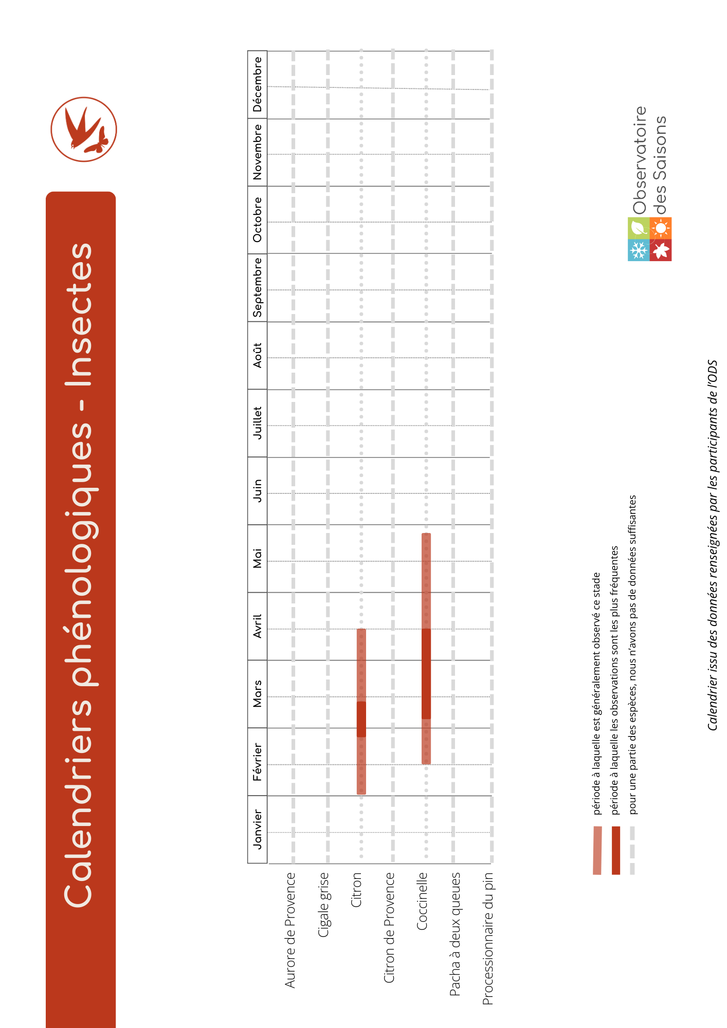 - Calendriers phénologiques : des arbres et arbustes, des herbacées, des insectes, des oiseaux, des reptiles et amphibiens